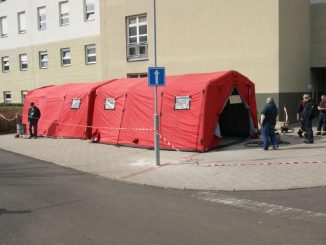 U ústecké Masarykovy nemocnice už vyrůstá stanoviště na testování na koronavirus. Hasiči instalují u nemocnic průjezdné stany s kontejnery, kde obyvatele vyšetří.